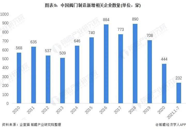 以成立時(shí)間為限來看,我國近年來閥門制造企業(yè)新增數(shù)量逐漸增多,呈不斷遞增態(tài)勢。2010年以來,年均新增670家左右。其中,2018年增速最高,單年新增890家相關(guān)企業(yè)。截至2021年7月30日,2021年共計(jì)新增232家企業(yè)。