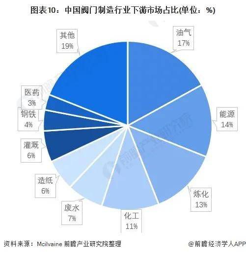 閥門是現(xiàn)代工業(yè)建設(shè)體系中的關(guān)鍵設(shè)備之一,幾乎所有建筑項(xiàng)目、控制系統(tǒng)等工程中均有應(yīng)用。因此,閥門廣泛的應(yīng)用于各個(gè)工業(yè)細(xì)分領(lǐng)域。目前,主要的閥門應(yīng)用領(lǐng)域包括:石油天然氣、電力、化工、自來水和污水處理、造紙、冶金、制藥、食品、采掘、有色金屬、電子等行業(yè)。其中,石油天然氣、能源電力和煉化、化工領(lǐng)域是閥門最重要的應(yīng)用領(lǐng)域。根據(jù)Mcilvaine的統(tǒng)計(jì),在閥門的下游需求市場中,包含鉆采、運(yùn)輸和石化在內(nèi)的石油天然氣領(lǐng)域占比最高,達(dá)到17%;其次是能源電力的需求,占據(jù)了閥門下游市場需求的14%;排名第三第四的下游領(lǐng)域分別為煉化與化工,占比分別為13%與11%。前四大領(lǐng)域的市場需求合計(jì)占全部市場需求的55%。