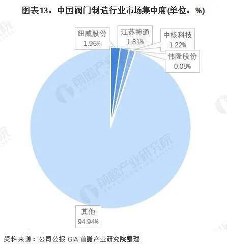由于我國閥門制造業(yè)產(chǎn)出產(chǎn)品的技術(shù)要求不高,行業(yè)整體的資金壁壘、技術(shù)壁壘、政策壁壘等因素均相對(duì)較低,因此我國閥門制造行業(yè)參與者較多,在中低端閥門市場呈現(xiàn)完全競爭態(tài)勢。而在我國閥門制造行業(yè)的上市企業(yè)中,紐威股份(603699)處于絕對(duì)龍頭地位。