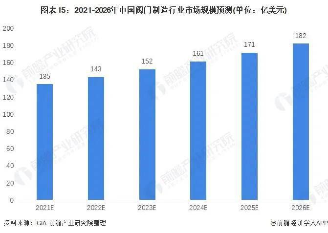 根據(jù)GIA的預(yù)測數(shù)據(jù),2021-2026年,我國閥門制造行業(yè)年復(fù)合增速為6.2%,預(yù)計(jì)到2026年末,我國閥門制造市場規(guī)模能夠達(dá)到182億美元,較2020年上升43.47%。